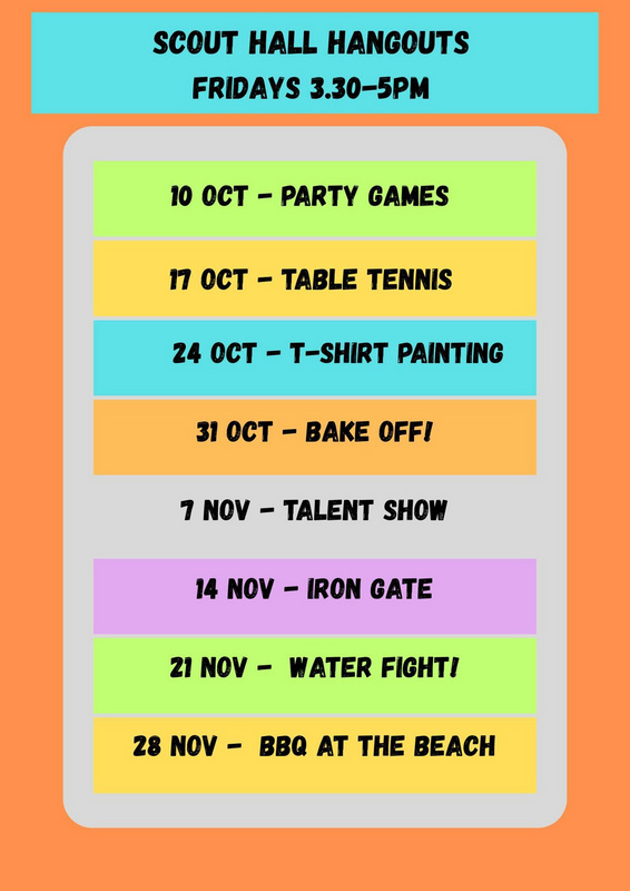 Term 4 Scout Hall Hangouts! for years 7 and up, 3.30 till 5pm Fridays, come along and join in. Caregivers please either fill in the link below if your child hasn't attended before or pop in and see us on Friday. We've put up a rough schedule of activities, these are subject to change due to weather/rangatahi input/energy!!! Take special note of the Talent show on 7 Nov and start planning your act!
